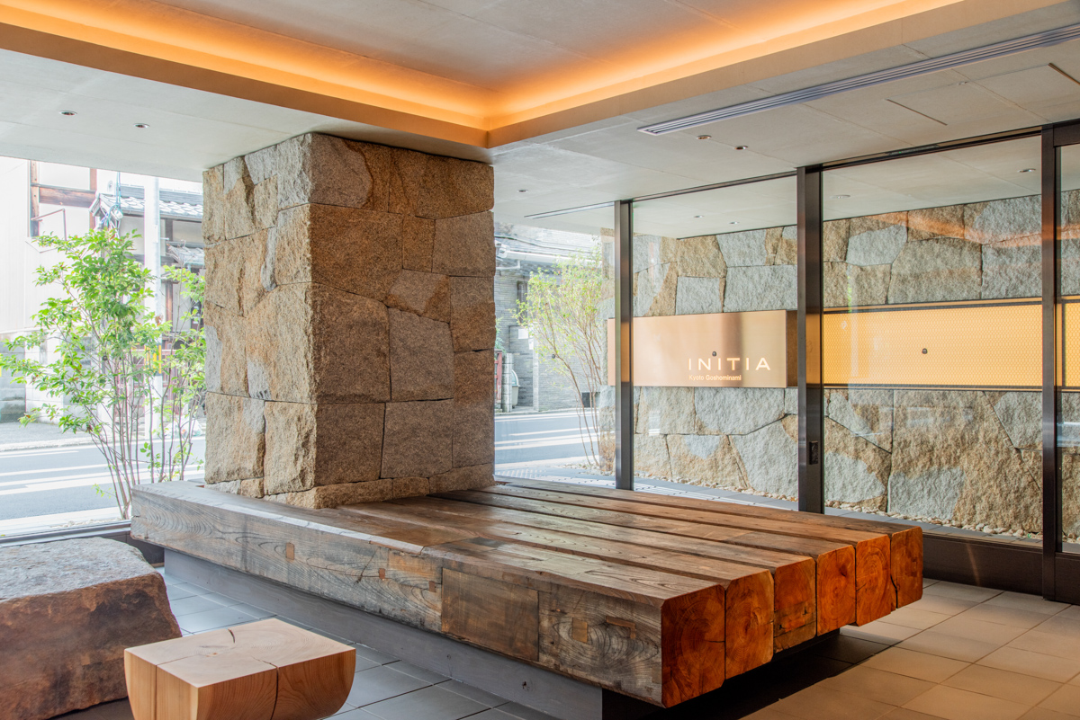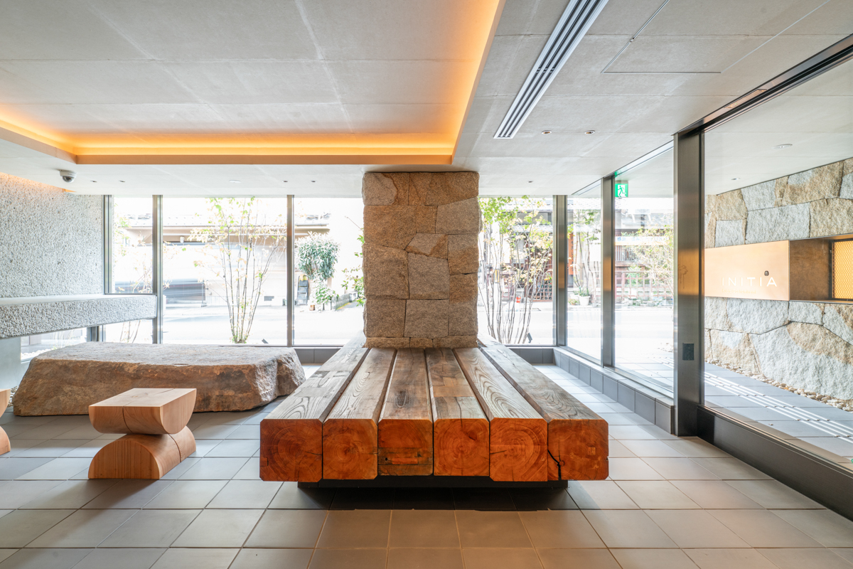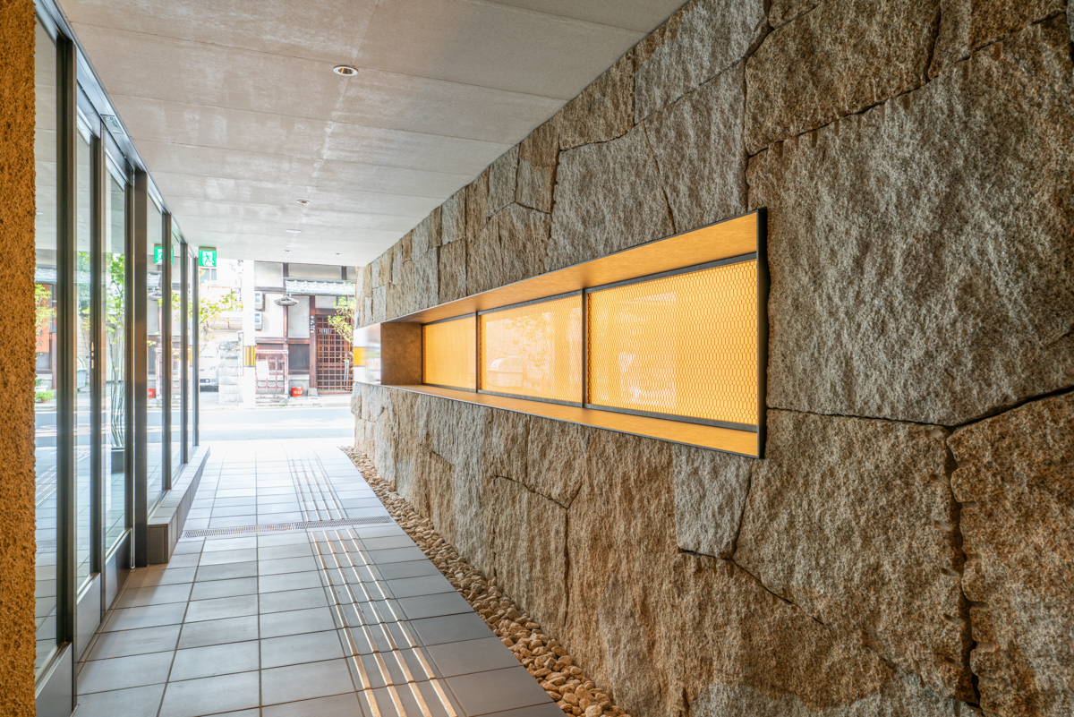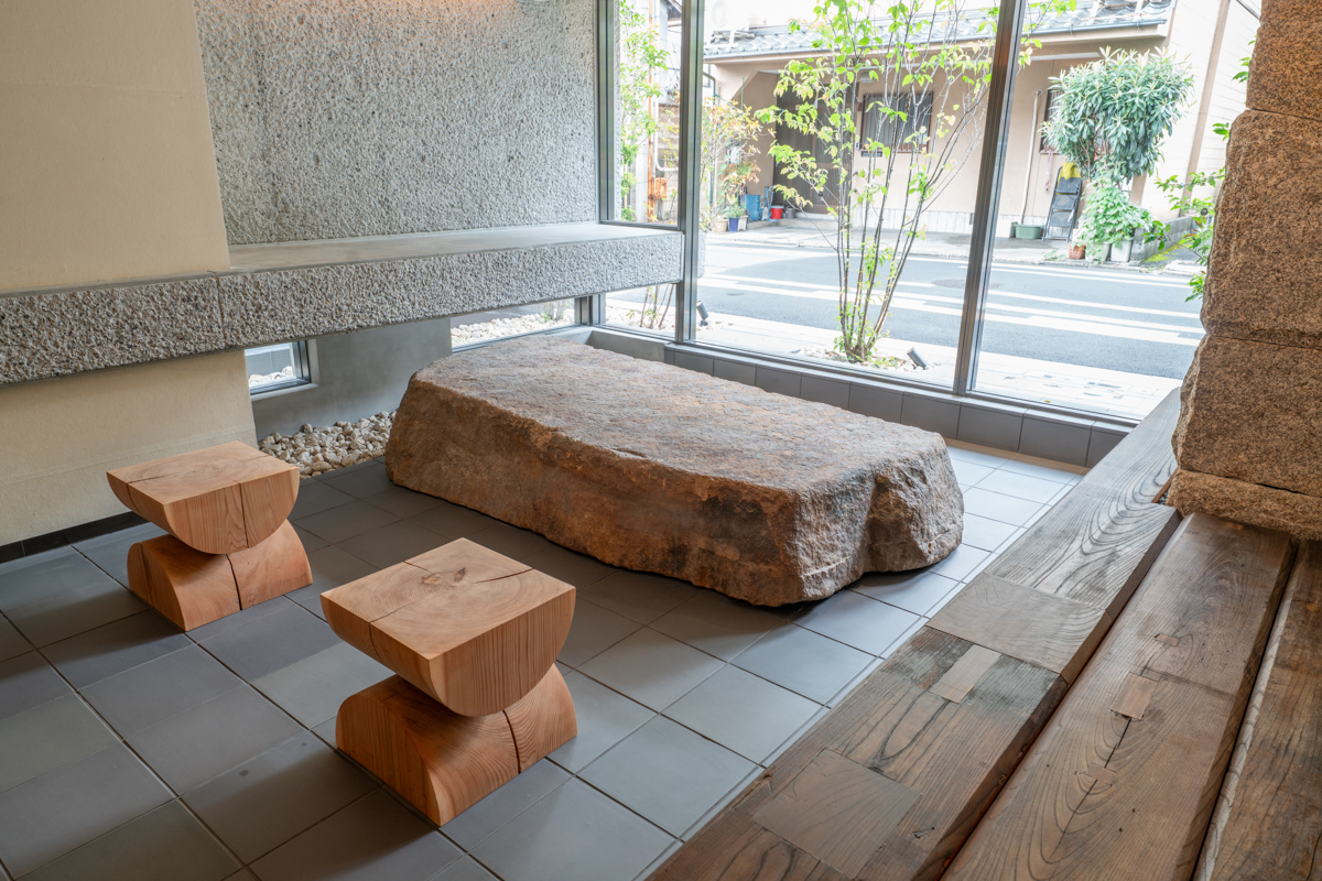 ロビーの景色を特徴づける石テーブルには丹波鞍馬石を、壁面には瀬戸内白石島産の花崗岩を使用しました。