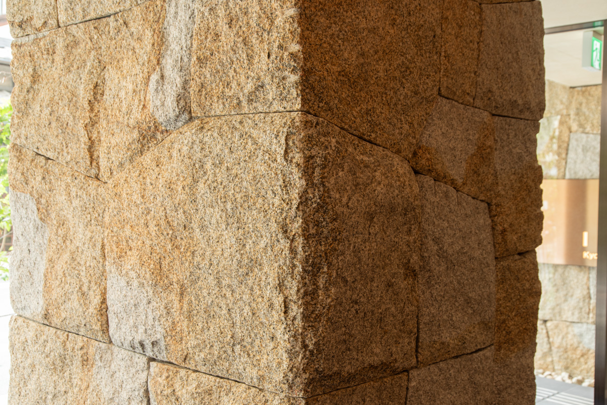 本プロジェクトでは石材そのものの迫力を最大限引き出すために、厚さ100mm程度に加工した石材を、石引アンカーと引き金物で裏から引っ張りつつ、石を組み合わせて石積みしました。