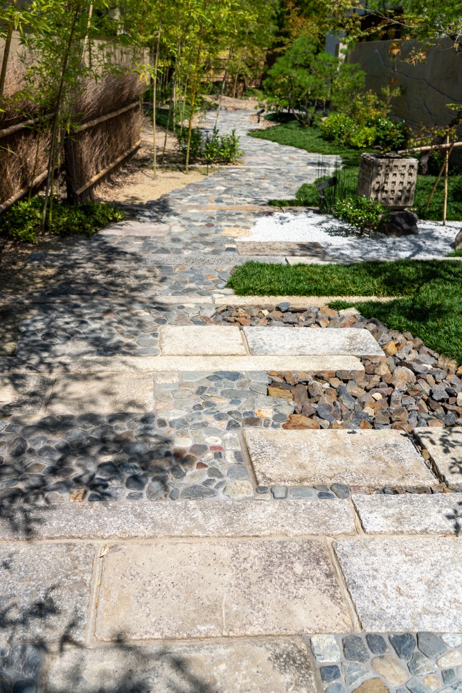 玄関庭は、近隣の景勝地「保津峡」に見立てた庭です。階段や園路で荒々しく蛇行する保津川の流れを、築山や景石、植栽により渓谷の風景を表現しました。玄関へ近づくにつれ、渓流をのぼり静かな山の奥地へと向かうような感覚を与え、滞在する邸宅への期待感を抱かせる空間となるよう作庭しました。