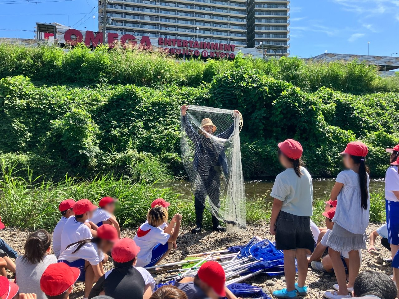 授業では、スタッフが事前に水深を確認、安全を確保した上で児童たちが川に入り、水の中の生き物採集を体験しました。ヌマエビやオイカワ、さらにはニゴイ、ヤゴやスッポンの幼体など、さまざまな生きものが見つかり、児童のみなさんたちは歓声を上げていました。採集後は観察と解説の時間を設け、生きものの特徴や命の大切さについて学びました。質疑応答も活発に行われ、流れの速さと魚の大きなの違いや身近な川の環境状態などへの関心を深める貴重な機会となりました。