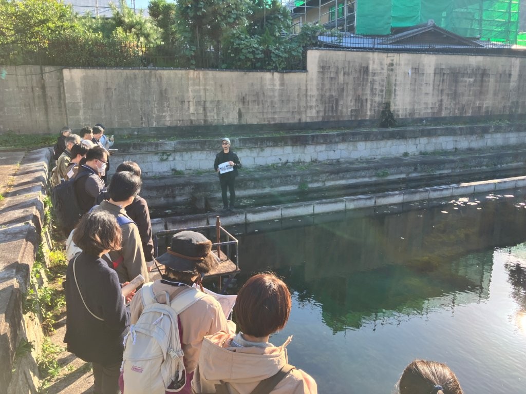 京都モダン建築祭は京都で守り継がれてきたモダン建築が特別に公開されるもので、本イベントでは、立命館大学理工学部環境都市工学科准教授の解説のもと、特別公開される水源池から大谷祖廟前までの埋設鋳鉄管の経路を辿り、昔からの防災技術としての「本願寺水道」の役割を学びました。参加者は見えない地下の歴史を感じながら、地域の環境・防災・文化資源への理解を深める貴重な機会となりました。